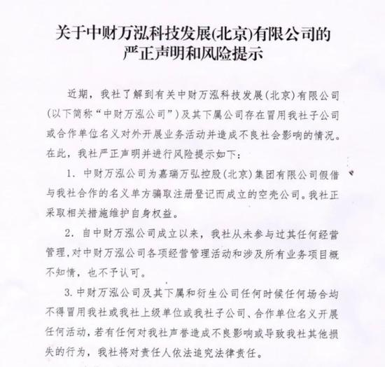 声明指出,中财万泓公司为嘉瑞万弘假借与中国财政经济出版社合作名义而成立的空壳公司。