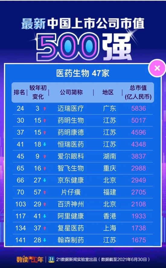 21数据新闻实验室统计发现,自2020年初疫情暴发以来,医药生物行业一共新增了12家市值500强公司,和十年前相比则增加了18家。智飞生物、康希诺、康泰生物等创新疫苗龙头市值相继突破千亿。