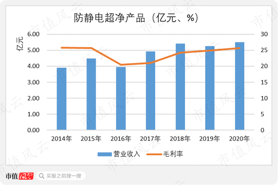 不过,风云君也发现,2014-2020年期间,防静电超净业务的营收增长几乎停滞,毛利率也经历过下滑。