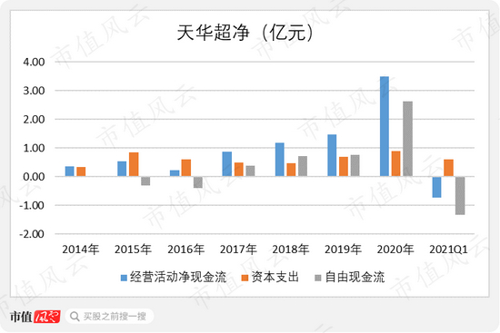 业绩增长的同时,天华超净的现金流也在变好。2020年,天华超净实现经营活动净现金流3.50亿元,自由现金流净流入2.62亿元,均较往年有明显提升。