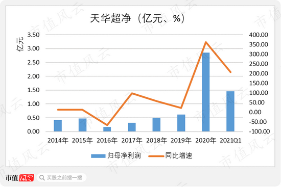 但2020年,天华超净实现归母净利润2.86亿元,同比增长了三倍多;2021年一季度,实现归母净利润1.46亿元,也已经超出了去年全年利润的50%。