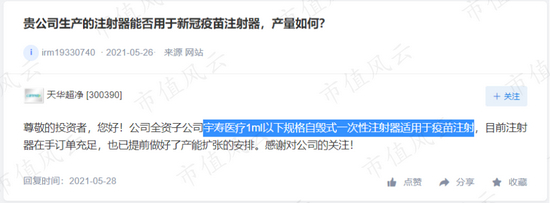 天华超净也在互动易回复投资者提问时表示:宇寿医疗的注射器适用于疫苗注射且目前在手订单充足。