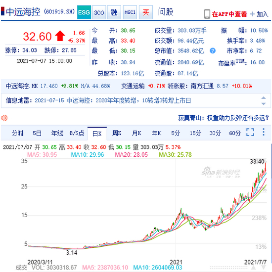 由于业绩持续爆发,中远海控最近一年的股价涨幅也是非常惊人。一年前的2020年5月,该股股价最低低至3.14元,而7月7日却盘中暴涨至33.4元,一年来暴涨964%。