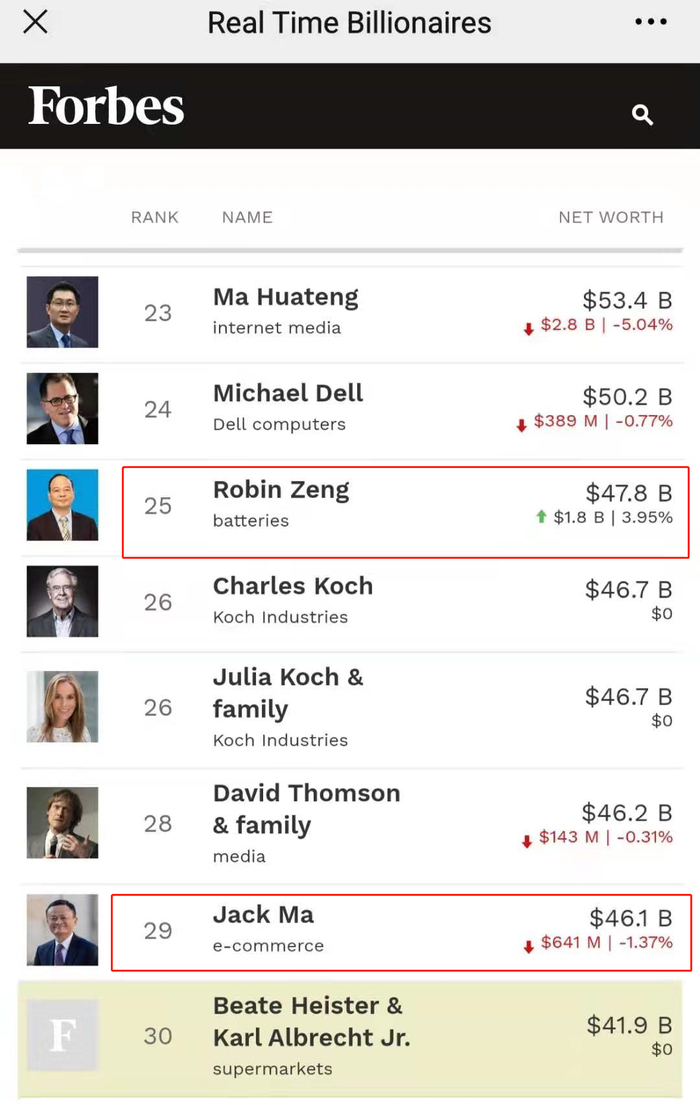 福布斯实时富豪榜数据显示,曾毓群当前全球财富排名达到第25位,首次超过了阿里巴巴创始人马云(财富461亿美元,位列第29位),距离腾讯创始人马化腾534亿美元的财富差56亿美元。