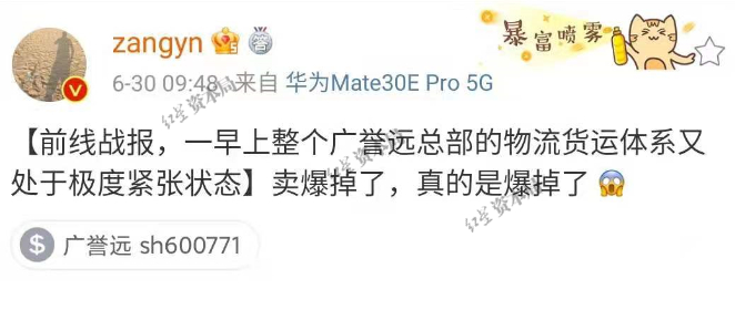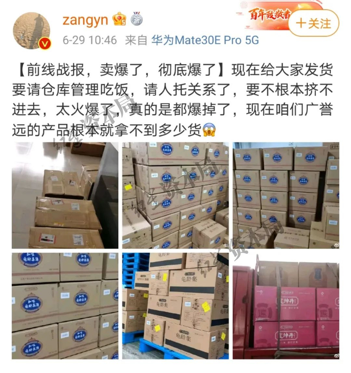 比如,以微博认证为“职业投资人”的用户@zangyn 为例,他曾多次发微博称,广誉远产品的销量暴增,其总部的物流货运体系处于极度紧张状态,“卖爆掉了,真的是爆掉了。”