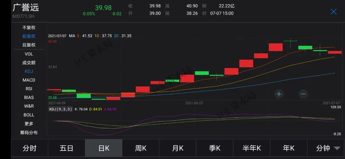 截至7月7日收盘,广誉远的收盘价报39.98元/股,跌0.05%。