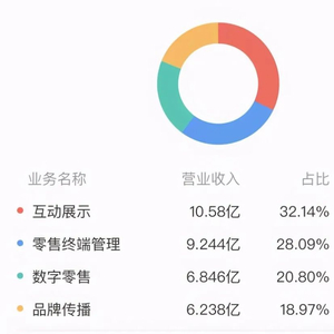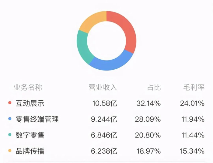 从收入占比来看,依托线下业务的“互动展示”和“零售终端管理”是公司两大营收来源,去年全年,“互动展示”营收10.58亿元,占比32.14%,“零售终端管理”占比28.09%,“数字零售”占比仅20.08%。