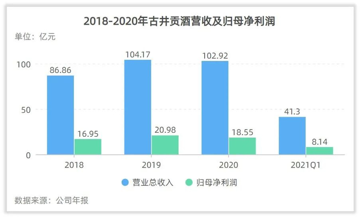 考虑到2020年疫情古井贡酒业绩基数较低影响,《蓝筹企业评论》选用2019年一季度的业绩为基地,计算得出2021年一季度营收增速为12.56%,归母净利润增速仅3.96%。