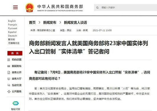 据中国商务部网站7月11日消息,商务部新闻发言人就美国商务部将23家中国实体列入出口管制“实体清单”答记者问。