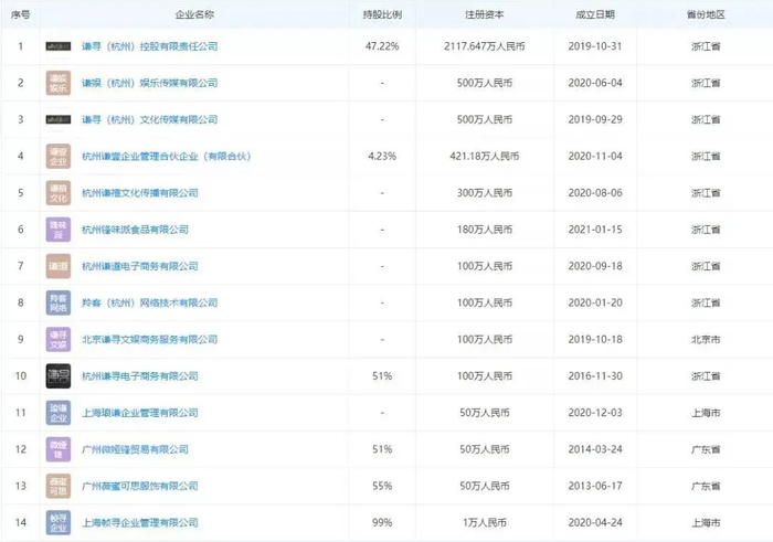2021年1月15日,杭州锋味派食品有限公司成立,法定代表人同样为董海锋,经营范围包括食品经营、食品农产品零售、食品农产品批发、服装服饰批发等。穿透后,杭州锋味派食品有限公司由谦寻(杭州)文化传媒有限公司100%持股。
