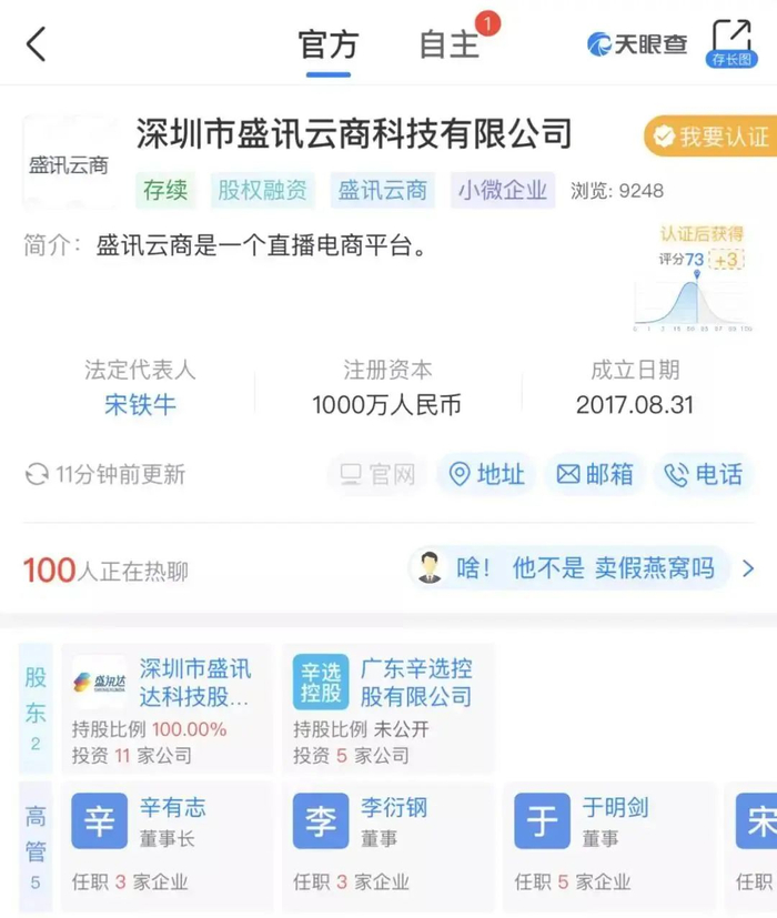 此外,辛巴还担任着电商直播平台盛讯云商的董事长一职。