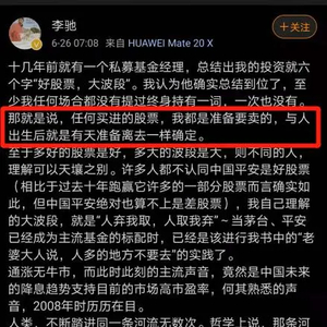 10多年过去,他的这种坚持为他带来了丰厚的回报。然而就在最近,6月26日,李驰在微博上表示,“任何买进的股票,我都是准备要卖的,与人出生后就是有天准备离去一样确定。”