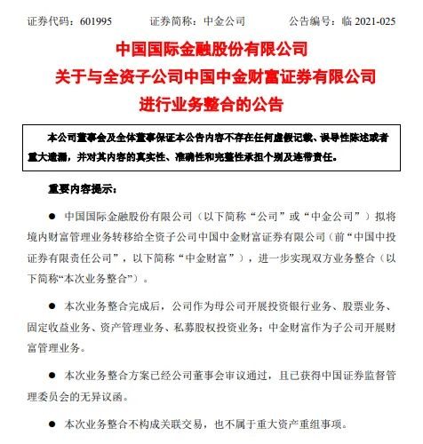 在完成并购四年之后,推动财富管理转型升级的中金公司,官宣了一项重大决定——与中金财富进行业务整合。