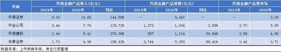 从代销金融产品收入来看,中信证券仍居榜首,为19.65亿元,同比增长144.55%;中金公司为7.76亿元,同比增长125.72%;中信建投揽收5.41亿元,同比增幅达276.36%;华泰证券为4.98亿元,同比增幅为188.42%。