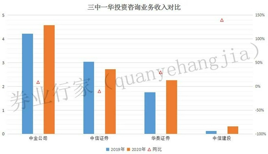 再来看另一项财富管理指标——投资咨询业务收入。中金公司2020年度揽收4.59亿元,同比增长8.75%;中信证券为2.73亿元,同比下降10.36%;华泰证券为2.27亿元,同比增长29.52%;中信建投仅有0.32亿元,同比增幅高达139.58%。