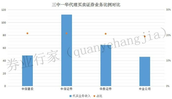 从代理买卖证券业务占比来看,中信建投、中信证券和华泰证券的差距很小,分别为20.71%、20.70%和20.54%;而中金公司略低,为19.49%。