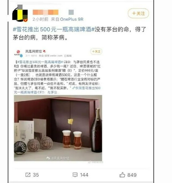 #500元一瓶雪花啤酒是智商税吗#这个话题下,有网友评论称:“泡沫太大了,喝不起。”还有网友吐槽:“没有茅台的命,得了茅台的病,简称茅病。”