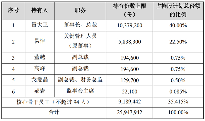 据悉,持股计划的对象包括董事长、总裁冒大卫,关键管理人员(原董事)易律,副总裁董越和高峰,副总裁、财务总监戈爱晶,监事会主席郝岩,占持股计划总份额的比例分别为40%、22.5%、0.75%、0.75%、0.5%、0.085%,合计约64.585%。这也是市场讨论的由头。
