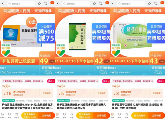 野马财经在京东、淘宝等电商平台上搜索发现,蓝芩口服液一盒售价为43元,百乐眠胶囊一盒为42元,黄芪精口服液为29元一盒,依帕司他片为28元每盒,苏黄止咳胶囊为49元每盒。均价仅为20-40元左右。