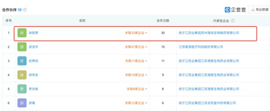 由于徐镜人一家十分低调,关于徐镜人的女儿和妻子并没有详细信息,但野马财经发现,企查查显示,与徐镜人合作次数最多,甚至超过徐浩宇的是一位叫徐丽琴的女士,合作次数达30次,位居第一,徐丽琴的所有企业为33家。