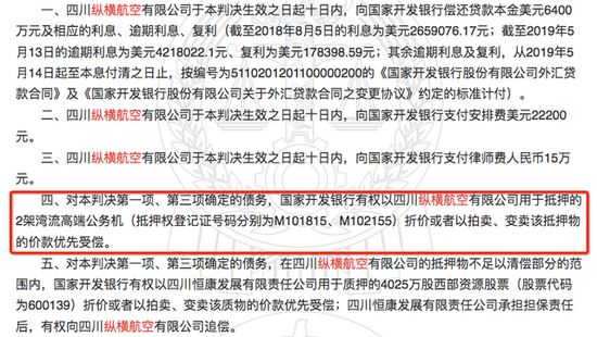 后续履行过程中,因贷款方未按约支付借款本息,2018年9月,纵横航空被起诉至法院。法院判决纵横航空偿还贷款本金6400万美元及相应的利息、逾期利息、复利等,国家开发银行有权对上述用于抵押的2架湾流高端公务机折价或者以拍卖、变卖该抵押物的价款优先受偿。