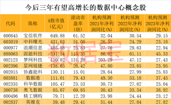 数据宝统计显示,目前与数据中心相关的概念股有113只,A股市值超万亿。7月以来永福股份、任子行、科创信息、中青宝、新元科技等涨幅居前。从增长潜力来看,根据5家以上机构一致预测数据,今后三年净利润均有望增长20%以上的概念股有12只。这12股中最新滚动市盈率不足30倍的分别是精工钢构、协鑫能科、科华数据、浪潮信息、星网锐捷、英维克等。
