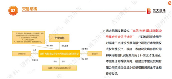 针对森梁置业翡丽云邸这个项目,2021年5月,光大兴陇信托有限公司(下称“光大信托”)发行成立了一款名为“光信·光乾·增益尊享30号集合资金信托计划”(下称“增益尊享30号”)的项目。根据光大信托向投资人提供的推介材料,这款集合信托的规模为3亿元,资金用途为“投向福建三木建设发展有限公司发行的类永续债,用于发行人补充流动资金”,期限为“1+N”年。