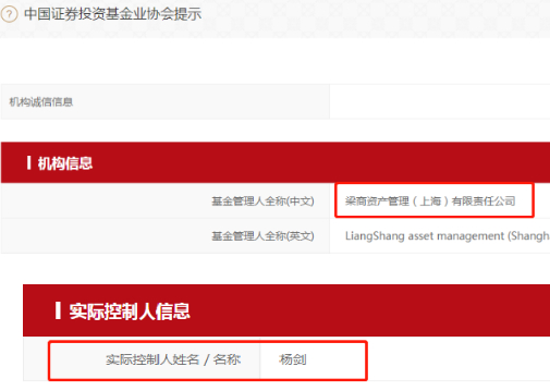 尽管工商系统中,梁商资本占股70%的大股东,是上海忠信徐企业管理有限公司。但是,在基金业协会的备案信息,公然写明了:梁商资本的实际控制人,是杨剑。