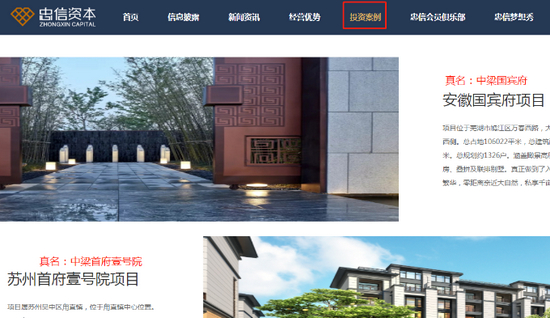 关键问题,忠信资本公司网站呈现的投资案例,几乎全部为中梁控股旗下地产项目,包括“安徽国宾府项目”、“苏州首府壹号院项目”、“安徽江督府项目”、“苏州独墅御湖项目”等,但在页面上,均不带“中梁”字样,表面工作做得非常到位。
