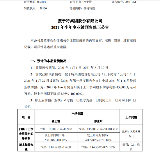 7月14日晚间,搜于特披露了一则2021年半年度业绩预告修正公告,将公司上半年业绩由预亏0至1.5亿元,修正为预亏9亿元至13.5亿元。去年上半年,搜于特还实现盈利3456.38万元。在解释原因时,搜于特提及了两点因素,涉及受新冠肺炎疫情影响以及公司资金流动性紧张带来的系列问题。