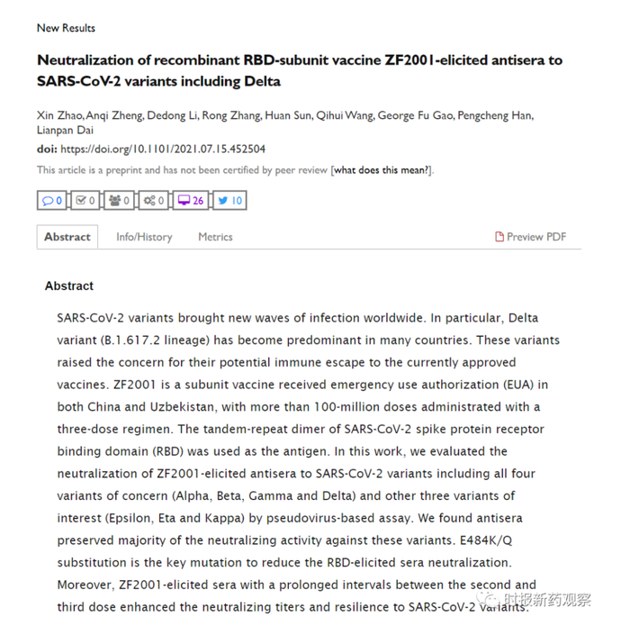 该项研究的样本为28名受试者的血清样本,针对Delta等7种新冠变体进行试验后发现,ZF2001很大程度上保留了中和作用,但功效略有降低。