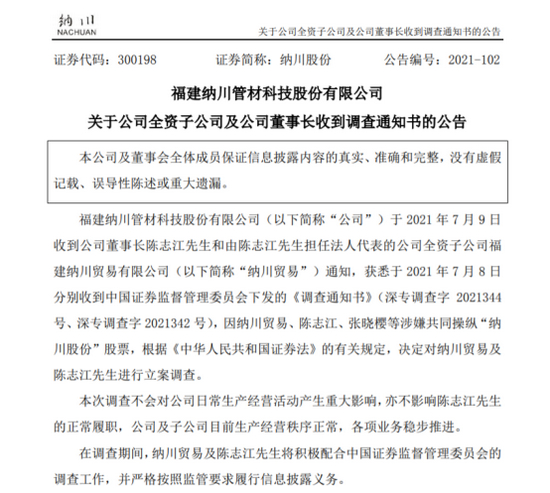 2021年7月9日,纳川股份(300198)发布公告称,公司董事长陈志江先生和由陈志江先生担任法人代表的公司全资子公司纳川贸易,分别收到中国证券监督管理委员会下发的《调查通知书》(深专调查字2021344号、深专调查字 2021342号),因纳川贸易、陈志江、张晓樱等涉嫌共同操纵纳川股份股票,根据《中华人民共和国证券法》的有关规定,决定对纳川贸易及陈志江先生进行立案调查。(纳川股份维权入口)