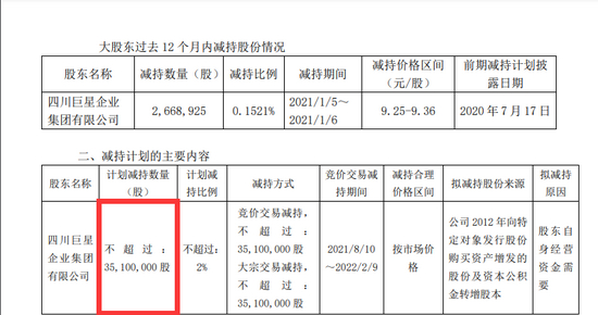 7月19日晚间,盛和资源突然发布公告称,持股5.367%的股东巨星集团计划15个交易日后的6个月内,通过集中竞价交易方式或大宗交易方式,减持公司股份不超过3510万股(按照今日收盘价计算,这部分股价市值约8.46亿元),即不超过公司总股本的2%。减持价格根据市场情况确定。在本减持计划公告之日起至减持计划实施期间,公司如发生派发红利、送红股、转增股本、增发新股或配股等除权、除息事项,减持股份数量将相应进行调整。