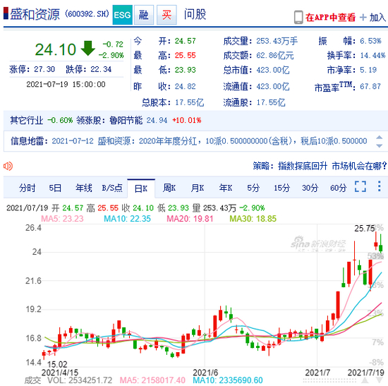 截至今日收盘,盛和资源报收24.10元,跌2.90%,换手率高达14.44%,成交62.86亿元,最新市值423.0亿元。