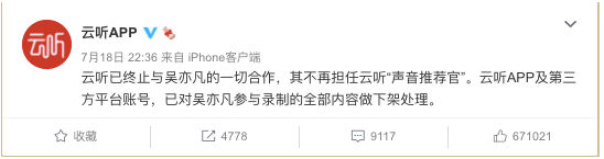 18日晚10点,中央广播电视总台音频客户端云听APP也宣布已终止与吴亦凡的一切合作。吴亦凡不再担任云听“声音推荐官”,并且强调,云听APP及第三方平台账号,已对吴亦凡参与录制的全部内容做下架处理。稍早前,央视新闻对其新歌《翱翔》做了删除处理。