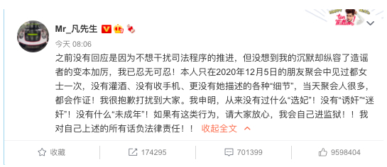 对于上述都美竹的“指控”,7月19日早晨,吴亦凡发文否认,称“如果有这类行为,我会自己进监狱!!我对自己上述的所有话负法律责任!!”
