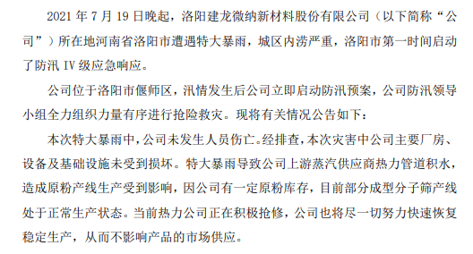 建龙微纳同日晚间公告,公司位于洛阳市偃师区,本次特大暴雨中,公司未发生人员伤亡。经排查,本次灾害中公司主要厂房、设备及基础设施未受到损坏。特大暴雨导致公司上游蒸汽供应商热力管道积水,造成原粉产线生产受到影响,因公司有一定原粉库存,目前部分成型分子筛产线处于正常生产状态。当前热力公司正在积极抢修,公司也将尽一切努力快速恢复稳定生产,不影响产品的市场供应。