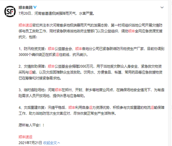 顺丰公益基金会捐赠2000万元支援河南防汛救灾,用于当地受灾群众人身安全、紧急救灾物资采购与运输,以及灾后困难群众生活救助。