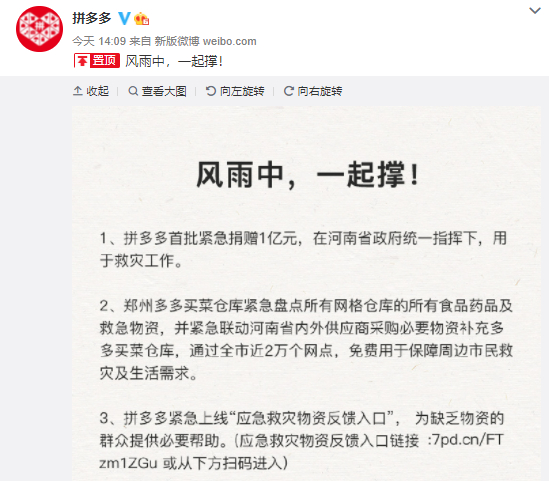 拼多多宣布首期捐款1亿元,驰援河南抗灾。