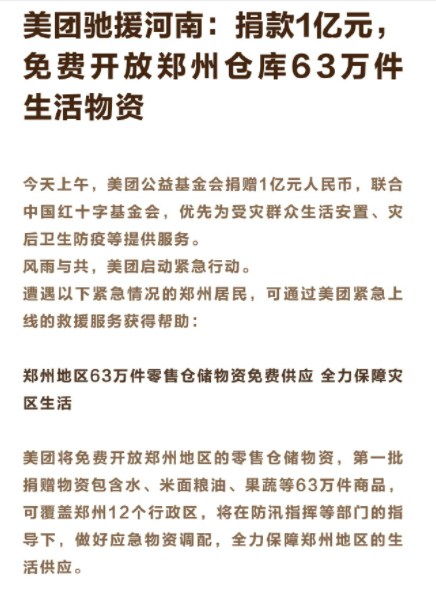 美团免费开放郑州地区的零售仓储物资,第一批捐赠物资包含水、米面粮油、果蔬等63万件商品,可覆盖郑州12个行政区,将在防汛指挥等部门的指导下,做好应急物资调配。
