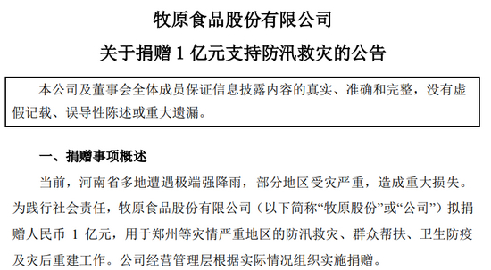 牧原股份7月21日盘后公告,公司拟捐赠1亿元,用于郑州等灾情严重地区的防汛救灾、群众帮扶、卫生防疫及灾后重建工作。