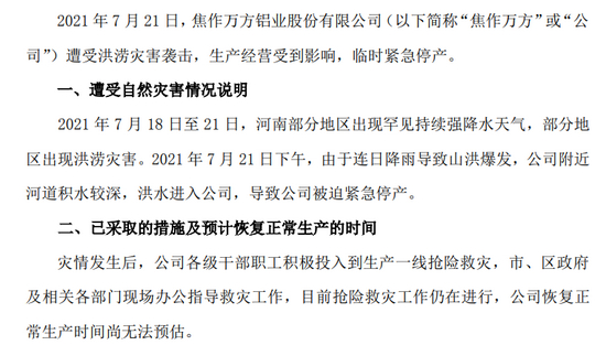 焦作万方7月21日晚公告,7月21日下午,由于连日降雨导致山洪暴发,公司附近河道积水较深,洪水进入公司,导致公司被迫紧急停产。目前抢险救灾工作仍在进行,公司恢复正常生产时间尚无法预估。