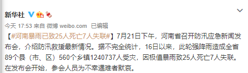 近日,河南遭遇历史罕见强降雨,防汛形势十分严峻。7月21日下午,河南省召开防汛应急新闻发布会,介绍防汛救援最新情况。据不完全统计,16日以来,此轮强降雨造成全省89个县(市、区)560个乡镇1240737人受灾,因极值暴雨致25人死亡7人失联。