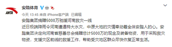 安踏集团决定向河南省慈善总会捐赠总计5000万元的现金及装备物资,用于采购救灾物资,支援灾区前线的救援工作,帮助受灾地区群众尽快恢复正常生活。