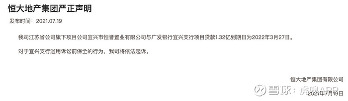 此消息旋即引发了恒大系的暴跌,恒大地产集团紧急发布“严正声明”称,该公司江苏省公司旗下项目公司宜兴市恒誉置业有限公司与广发银行宜兴支行项目贷款1.32亿到期日为2022年3月27日。并表示,将对于广发银行宜兴支行滥用诉讼前保全的行为“依法起诉”。不过据“壹地产”的报道,恒大昨天就把钱还掉了。