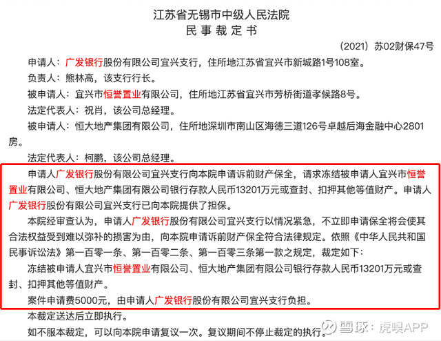 上述裁定书称,广发银行宜兴支行以情况紧急,不立即申请保全将会使其合法权益受到难以弥补的损害为由,向该院申请诉前财产保全,请求冻结宜兴市恒誉置业、恒大地产集团的银行存款人民币13201万元或查封、扣押其他等值财产。
