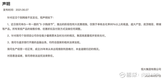 6月7日,恒大在其官网上进行了一一回应,一句话总结就是:经营一切正常,“成立25年来从未出现借款利息晚付、本金逾期归还的情况。对恶意造谣者,我司将依法追究法律责任”。