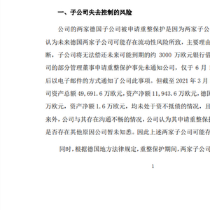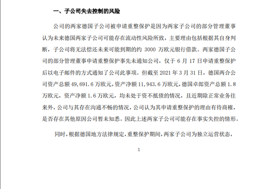 同时,公告还表示,基于目前公司对两家德国子公司拥有所有权,但在德国子公司申请重整保护后,无法对其实施直接有效的控制的现状,假设至2021年8月末公司公告半年报时,该现状未有实质性进展,公司计划在2021年半年报中,将两家德国子公司申请重整保护日前的经营成果纳入合并报表范围,申请重整保护日后的经营成果,包括收入、净利润将不被纳入合并报表范围,报告期末与其相关的净资产将列示于长期股权投资中。截止2021年3月末,两家德国子公司净资产共计约合人民币9.2亿元,公司会结合重整方案,合理评估相关资产潜在的减值风险。