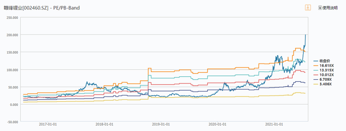 从利润来看,券商给予赣锋锂业2021年及2022年盈利一致预测分别为21.37亿元和29.52亿元,对应如今2700亿元市值,公司市盈率高达126倍和91倍。