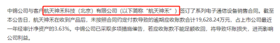 具体来看,7月24日,汇鸿集团公告称,中锦公司与航天神禾签订了系列电子通信设备销售合同。截至本公告日,航天神禾在收到产品后,未按照合同约定付款导致的逾期应收账款合计19,628.24万元,占上市公司最近一年经审计净资产的3.63%。